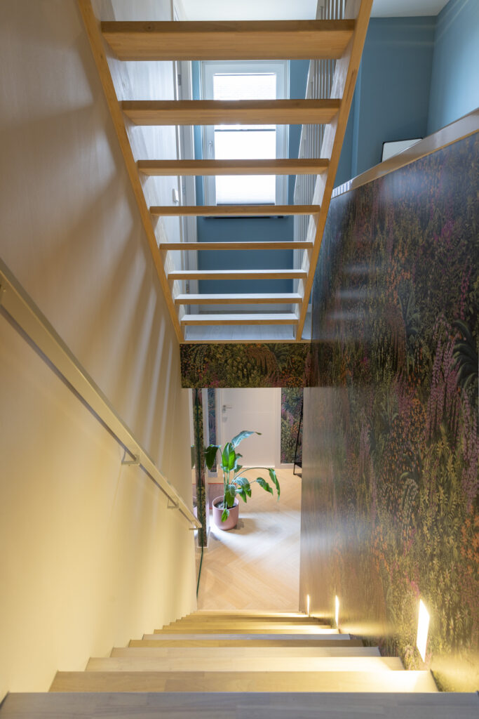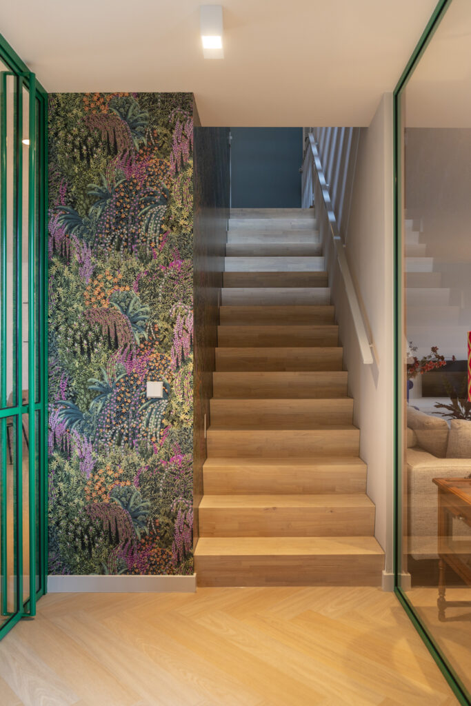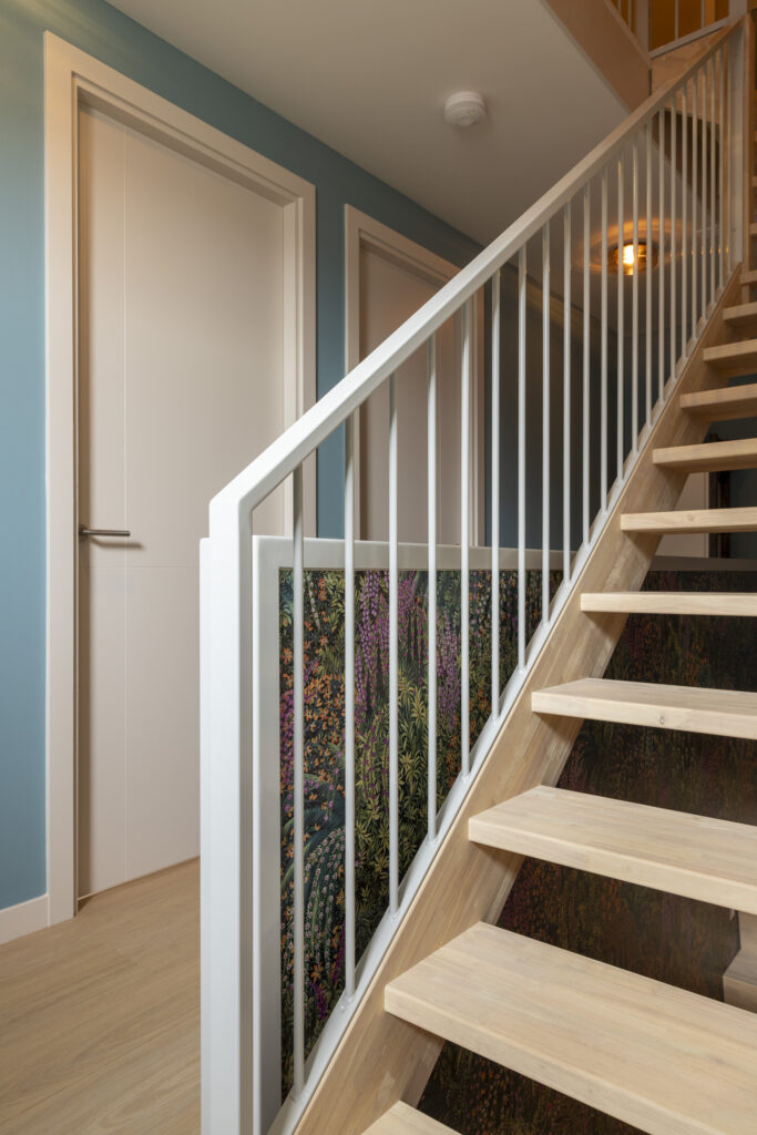Het behang van Cole and Son loopt door tot de eerste verdieping. De kleuren sluiten aan op de leefkeuken, waardoor de woning één geheel vormt zonder voorspelbaar te worden.