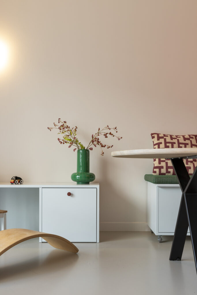 Bij de eettafel is er een maatwerkbankje gekomen die verrijdbaar is en opbergruimte biedt voor speelgoed.