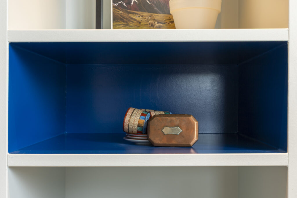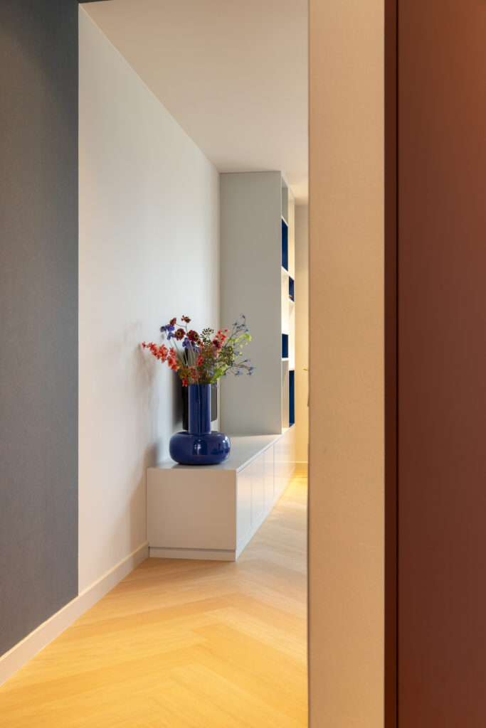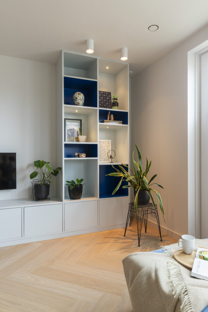 Een kobalt blauw accent komt terug in een aantal open vakken.