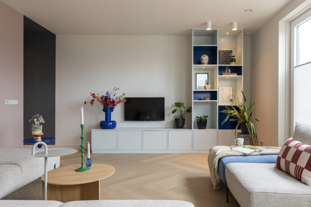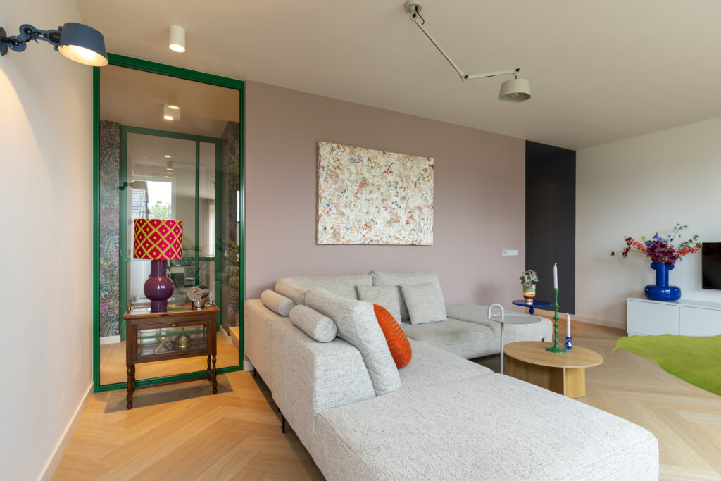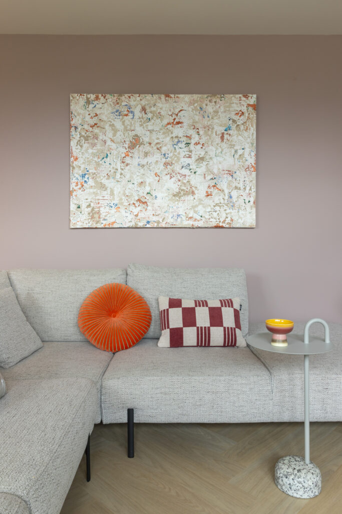 Daarbij heb ik kleurrijke accenten toegevoegd in kussens en accessoires die de zithoek karakter geven zonder de rust te doorbreken. De wand achter de bank heeft een zachte vergrijsde roze tint. De bewoners hebben zelf een persoonlijk kunstwerk laten maken wat helemaal bij hun past. Zo is er een mooie balans tussen rust en kleur gevonden.