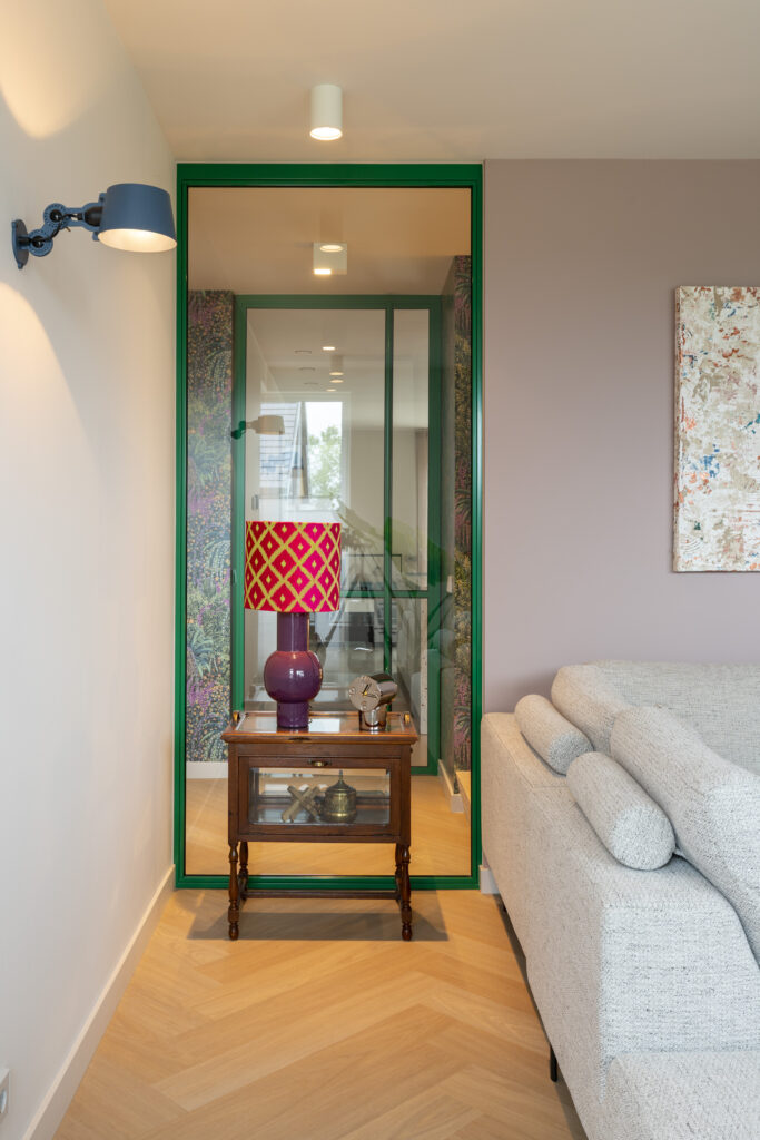 Een interieur moet verrassen, en dat begint wat mij betreft al zodra de voordeur opengaat. Daarom kreeg de hal een kleurrijk en expressief behang dat meteen de toon zet voor de rest van de woning. Het patroon brengt beweging in de ruimte en geeft bezoekers direct een warm en vrolijk welkom.