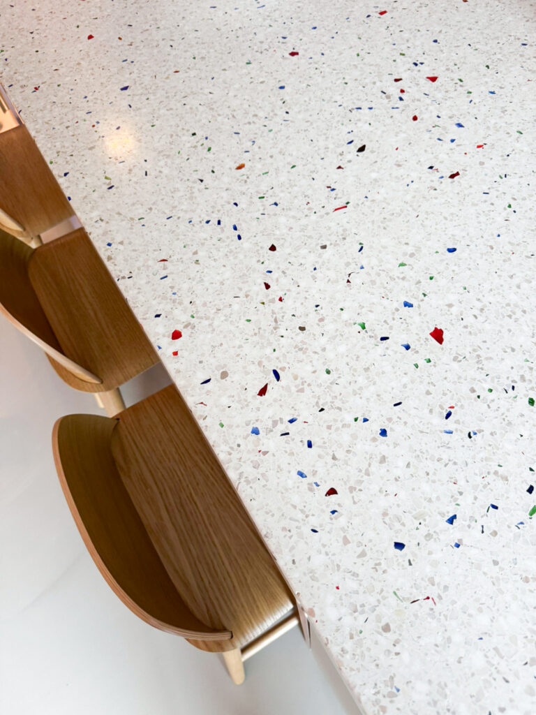 Het aanrechtblad is gemaakt van terrazzo. De kleuren zijn persoonlijk door de opdrachtgevers samengesteld en gemixt.